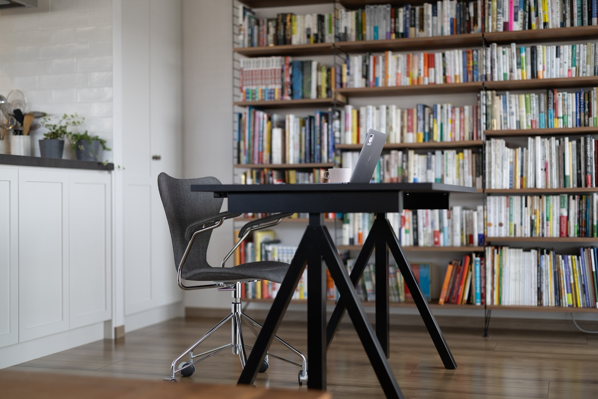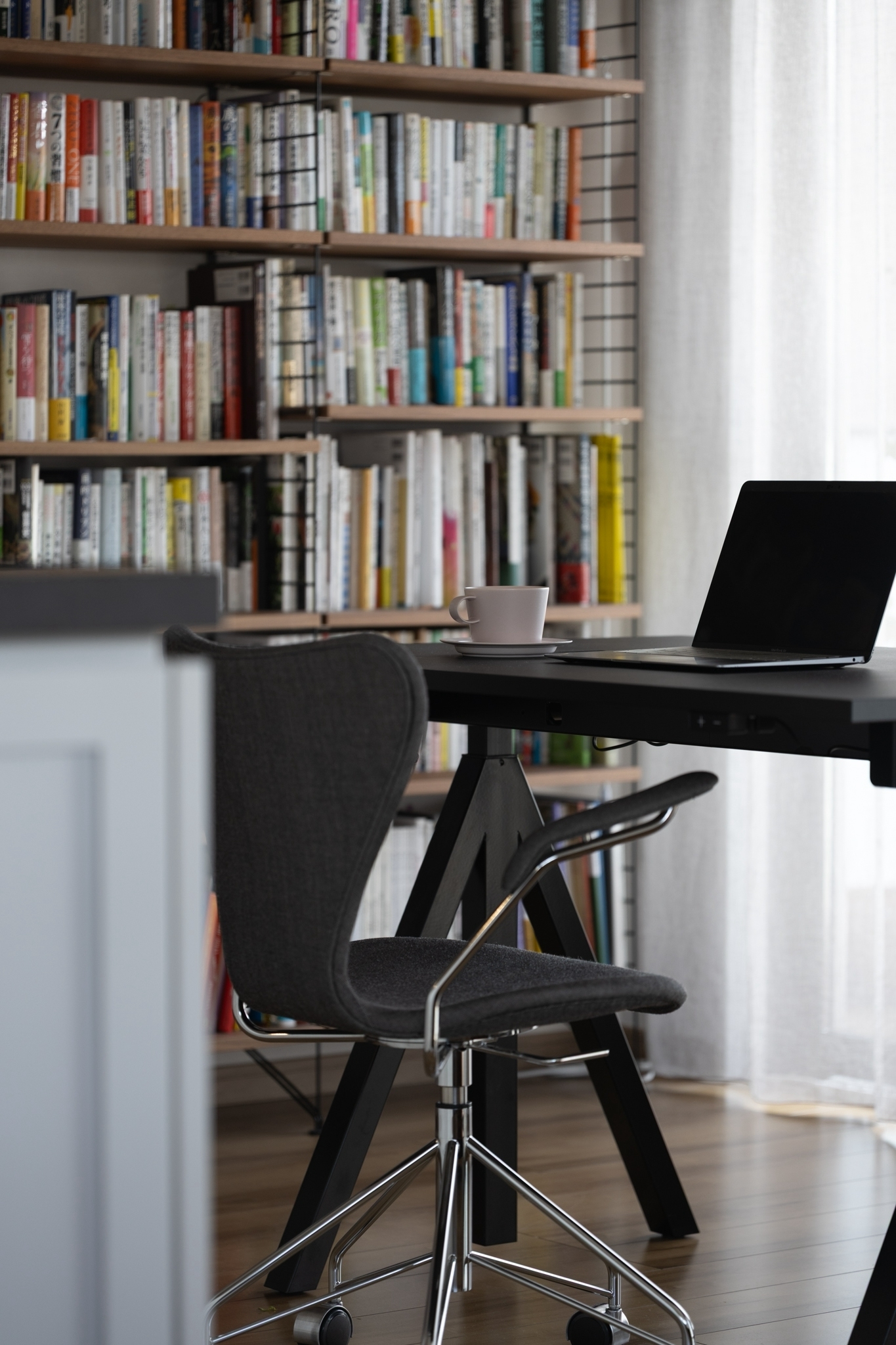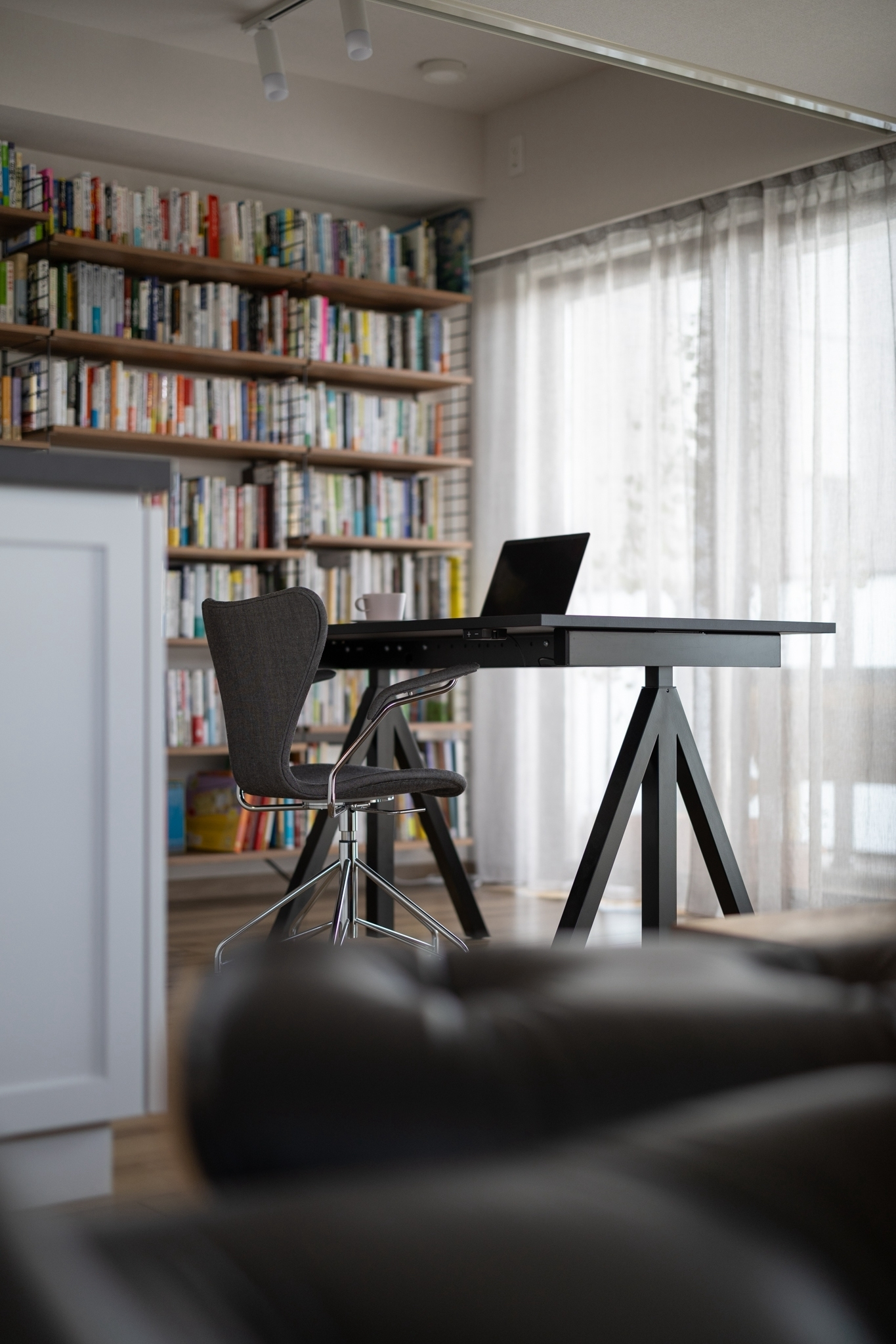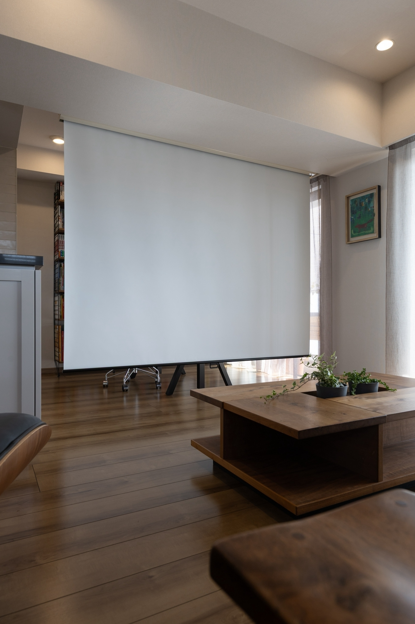 また、長い時間を過ごされるワークスペースは、陽の光が差し込む特等席に配置するなど、お客様のライフスタイルに寄り添った細やかなプランニングを取り入れています。また、空間に溶け込むよう、天井の梁に沿ってスクリーンを設置し、必要な時にプロジェクターを投影できるよう配慮しました。